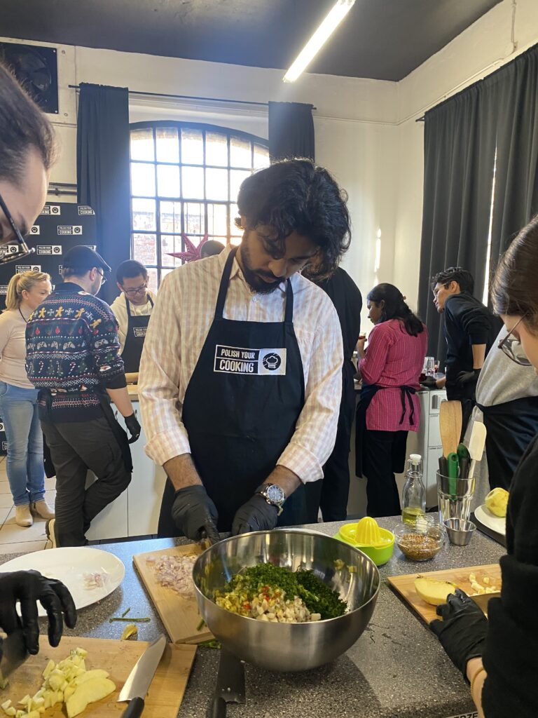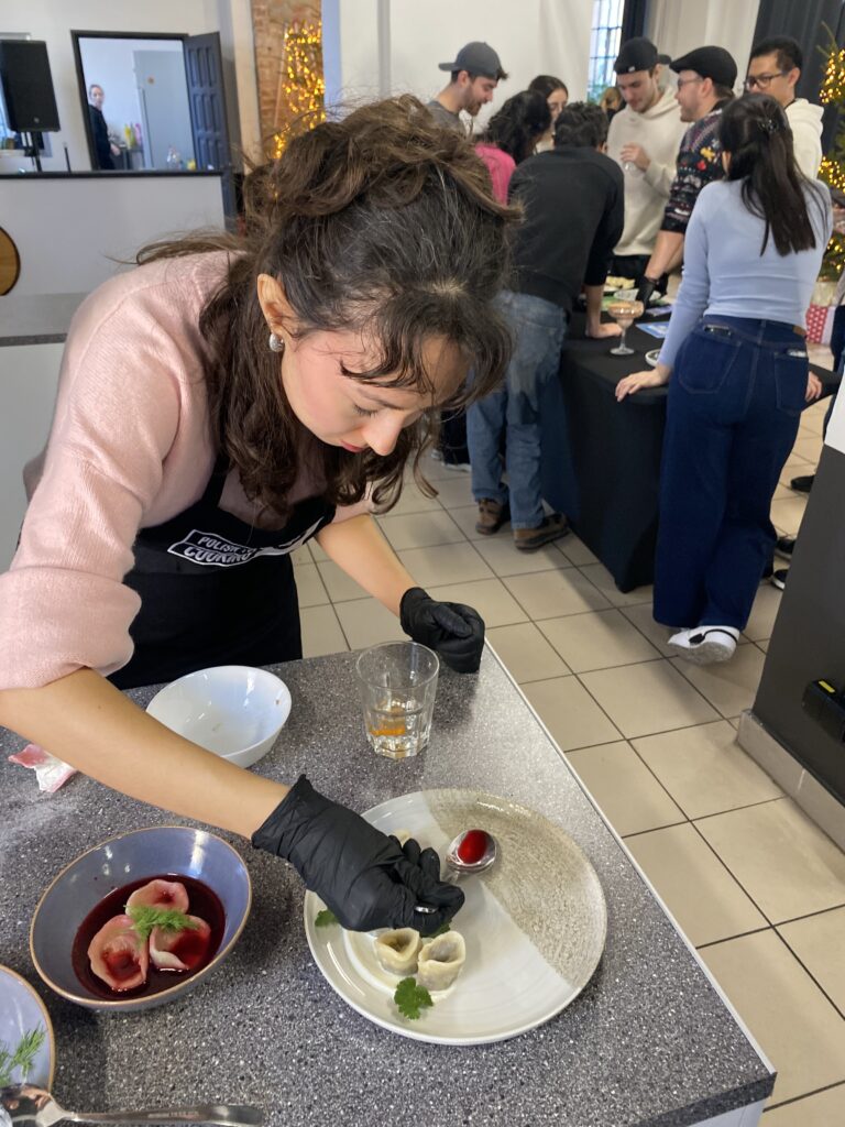 During the workshop, the students prepared classic pierogi filled with potatoes and mushrooms, carefully working on dough consistency and filling balance. They also cooked traditional barszcz (Polish beetroot soup), learned the precise preparation techniques required for fish tartare, and baked aromatic gingerbread cookies, a beloved element of Polish culinary tradition.